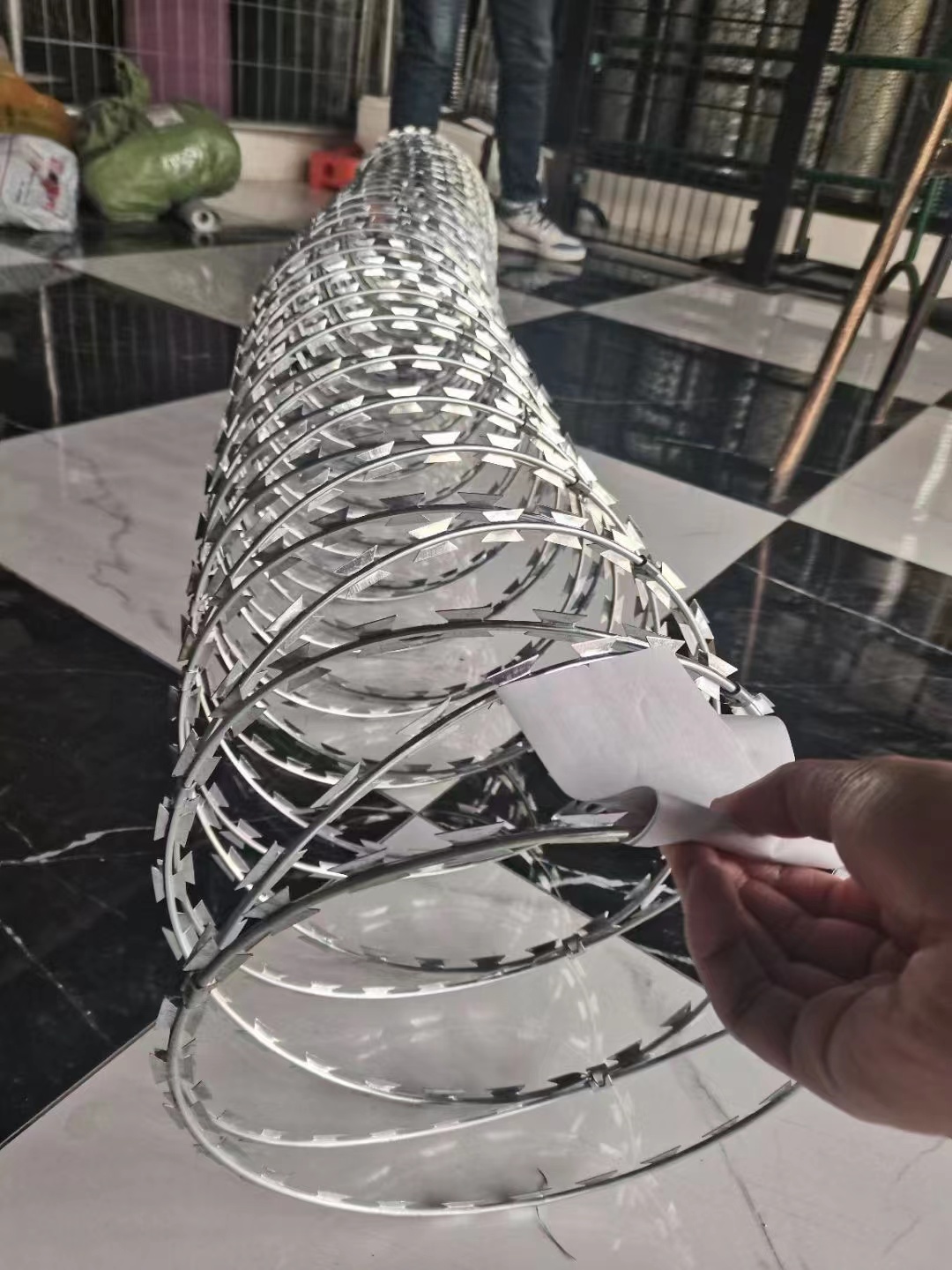 在壓縮過程中也許會有個別刺絲滾籠內部接頭崩開的現象,所以拆開是一點要注意。其次在刺絲滾籠安裝前一定要確認刺絲滾籠安裝基礎的牢固性,鐵路上的刺絲滾籠有的安裝在水泥立柱上,有的安裝在金屬護欄網頂部,不管是水泥立柱還是金屬護欄網我們一定要確保他們安裝牢固,否則容易對刺絲滾籠安裝人員造成人身傷害。
