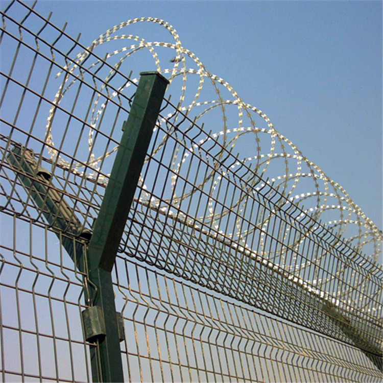 表面處理:表面鍍鋅后浸塑。在監獄內距離獄墻5m處設置防攀爬金屬隔離網。根據防攀爬金屬隔離網的設計要求,采用立式Y式型柱、鋼絲網加蛇腹型刀刺網。