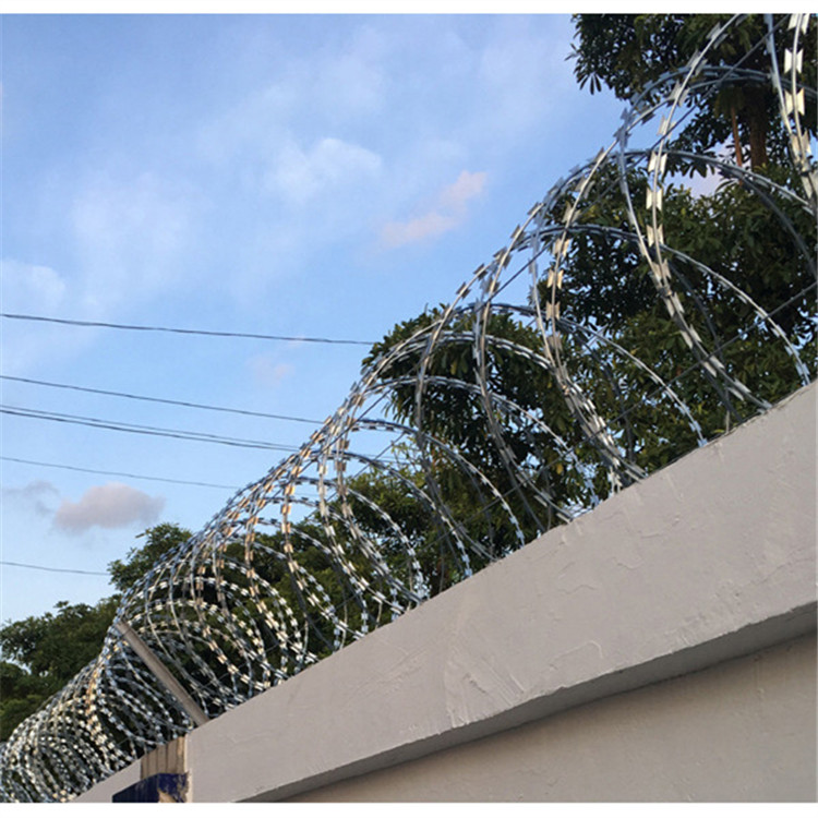 它是用不同材質(zhì)的鋼板與不同材質(zhì)的絲兩種原材料組合而成,先把所需材質(zhì)的鋼板沖壓出刀片的尖刀直條,在和所需材質(zhì)的絲包裹在一起,在制作出我們所需要的圈直徑即可,刀異常的鋒利,只要觸摸到就會被刺傷,不可能讓非法分子有攀爬翻越的機會,是現(xiàn)代社會各場所圍墻安裝的最佳防護(hù)隔離網(wǎng)。