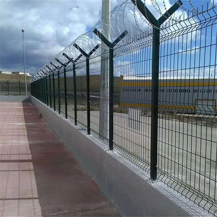 機(jī)場(chǎng)圍界又稱作“機(jī)場(chǎng)護(hù)欄”、“Y型安全防御護(hù)網(wǎng)”,它是由V型支架立拄,加強(qiáng)型焊接片網(wǎng),安全防盜連接件和熱鍍鋅刀片剌籠組成。