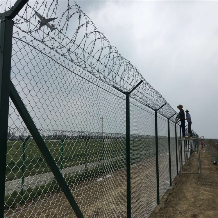 機場護欄網是由V型支架立柱加強型焊接片網安全防盜連接件和熱鍍鋅刀片刺籠組成強度和安全防御性級別很高。近年來,被廣泛應用在機場,事基地等高安全場所 。