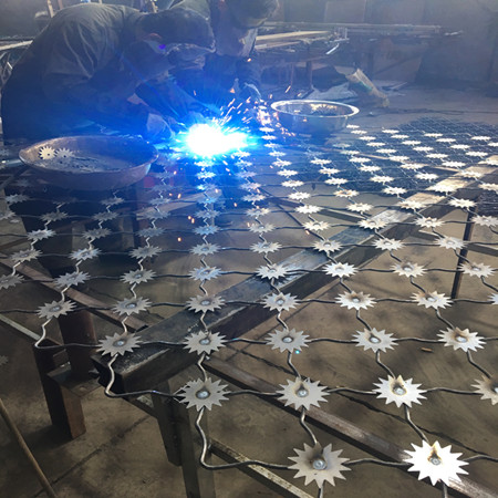 1、梅花刺片:梅花剌片直徑不小于7.5cm (直徑6cm、7cm、8cm) ,刺片厚1.5mm ,采.用Q235低碳鋼板沖壓成型。梅花刺片用氬弧焊將梅花形刺片焊接在美格網的節點上,形成刺形保護,有效的防止了手握腳攀。