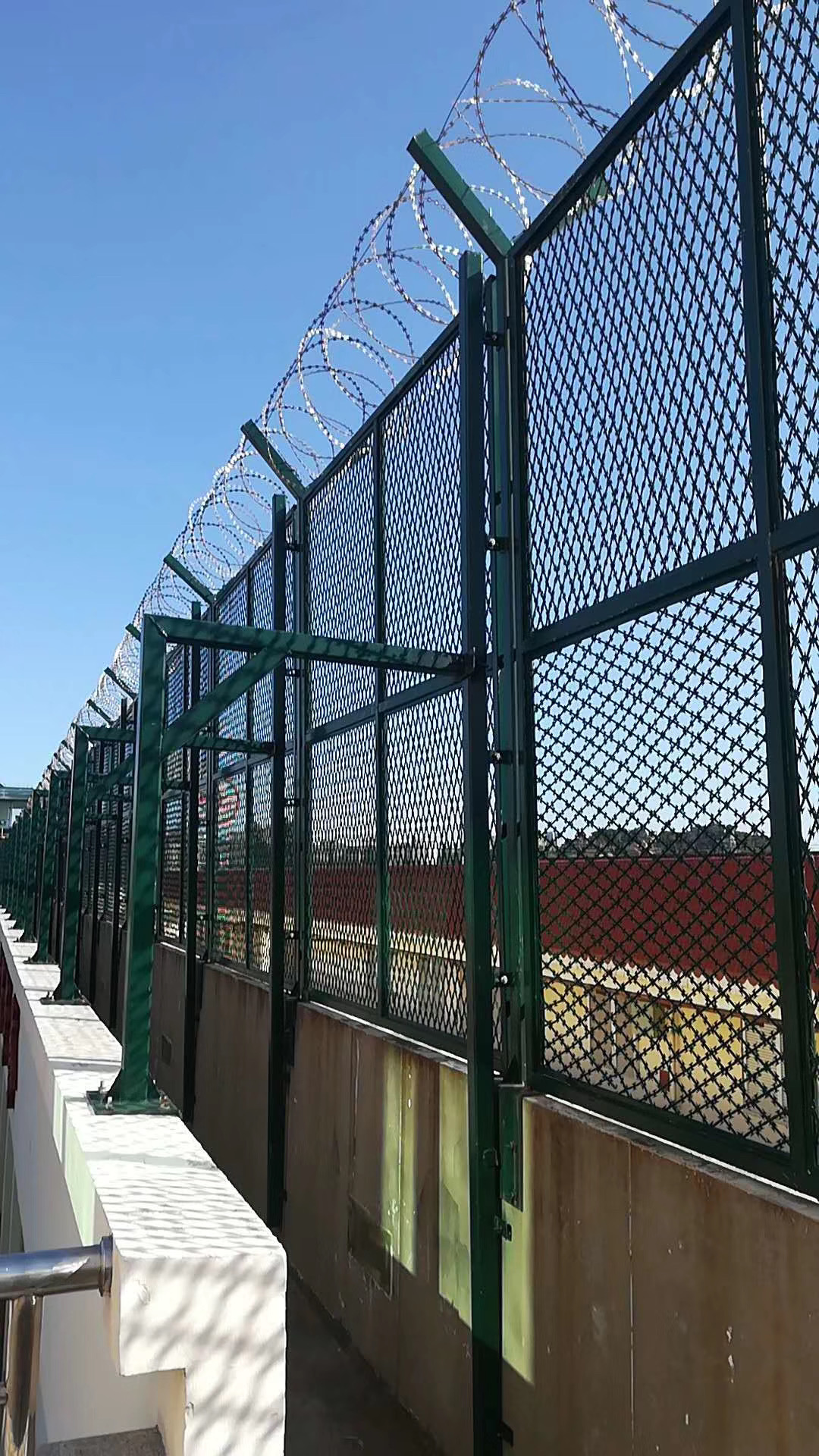 表面處理:表面鍍鋅后浸塑 。在監(jiān)獄內(nèi)距離獄墻5m處設(shè)置防攀爬金屬隔離網(wǎng)。根據(jù)防攀爬金屬隔離網(wǎng)的設(shè)計(jì)要求,采用立式Y(jié)式型.柱、鋼絲網(wǎng)加蛇腹型刀刺網(wǎng)。